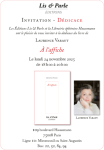 Librairie éphémère Haussmann : Dédicace du livre À l'affiche, par Laurence Varaut, le lundi 24 novembre 2025 de 18 h 00 à 20 h 00   Les Éditions Lis & Parle et la Librairie éphémère Haussmann ont le plaisir de vous…