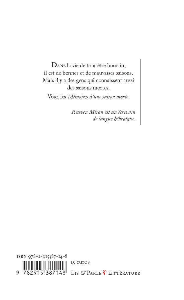 Mémoires d’une saison morte est le premier livre de Reuven Miran traduit en français. Puissent les lecteurs et la critique littéraire reconnaitre le talent de cet écrivain qui a reçu de nombreux prix dans le monde pour l’ensemble de son œuvre, d’autant plus que nous bénéficions d’une élégante et remarquable traduction dans la langue de Molière.