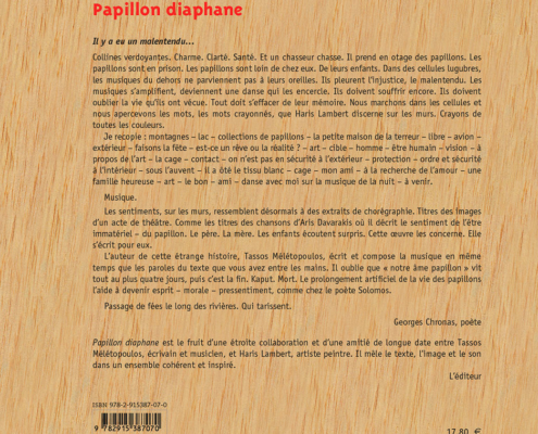 Né à Athènes en 1956, Tassos Mélétopoulos (Τάσος Μελετόπουλος) est l’auteur de sept livres, dont Papillon diaphane. Il a travaillé comme rédacteur au sein de l’équipe de Manos Hadjidakis, créateur de l’émission « Le Troisième programme » à la Radio télévision hellénique. Il a participé à divers festivals et concours, tels que l’Août musical à Héraklion en Crète, le Concours musical de la chanson grecque à Corfou, organisé par Manos Hadjidakis, etc. +d’info sur l’auteur