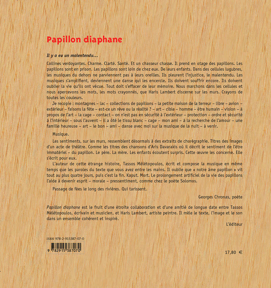 Lorsqu’advient l’adversité, la synergie et les forces de l’amour permettent presque toujours de trouver une issue. Papillon diaphane s’inspire de faits réels, transposés par l’auteur au monde de la nature. Tassos Mélétopoulos dédie son livre à toutes les personnes injustement privées de leur liberté.
