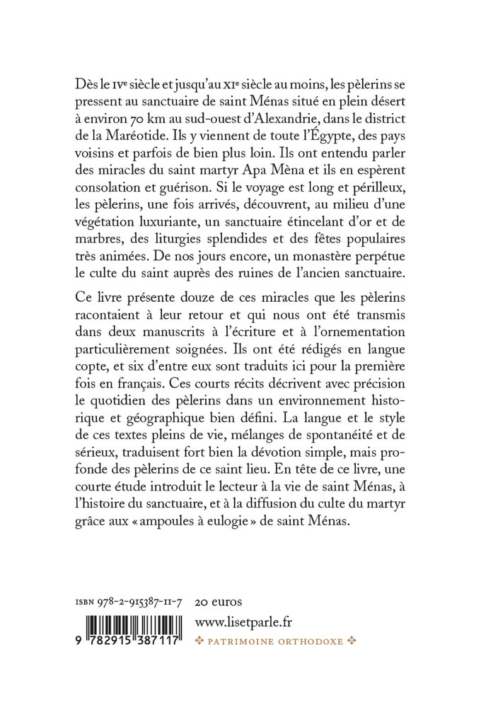 Ce livre présente douze de ces miracles que les pèlerins racontaient à leur retour et qui nous ont été transmis dans deux manuscrits à l’écriture et à l’ornementation particulièrement soignées. Ils ont été rédigés en langue copte, et six d’entre eux sont traduits ici pour la première fois en français. Ces courts récits décrivent avec précision le quotidien des pèlerins dans un environnement historique et géographique bien défini. La langue et le style de ces textes pleins de vie, mélanges de spontanéité et de sérieux, traduisent fort bien la dévotion simple, mais profonde des pèlerins de ce saint lieu. En tête de ce livre, une courte étude introduit le lecteur à la vie de saint Ménas, à l’histoire du sanctuaire, et à la diffusion du culte du martyr grâce aux « ampoules à eulogie de saint Ménas ».