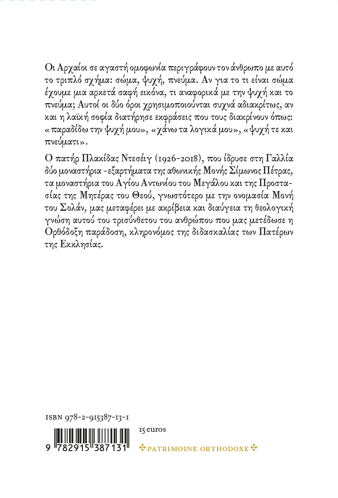 La collection « Patrimoine orthodoxe » s’enrichit en 2025 du livre du père Placide Deseille (1926-2018), « Σώμα, ψυχή, πνεύμα ». Le titre original en français de cet ouvrage est « Corps, âme, esprit par un orthodoxe » publié aux Éditions Le Mercure Dauphinois en 2004, dans une collection qui a pour titre : « [corps – âme – esprit] choisir la guérison », qui propose aux représentants de différentes traditions spirituelles présentes en France de définir et d’expliquer, selon leur point de vue, la nature trine de l’homme, une notion pour le moins complexe.